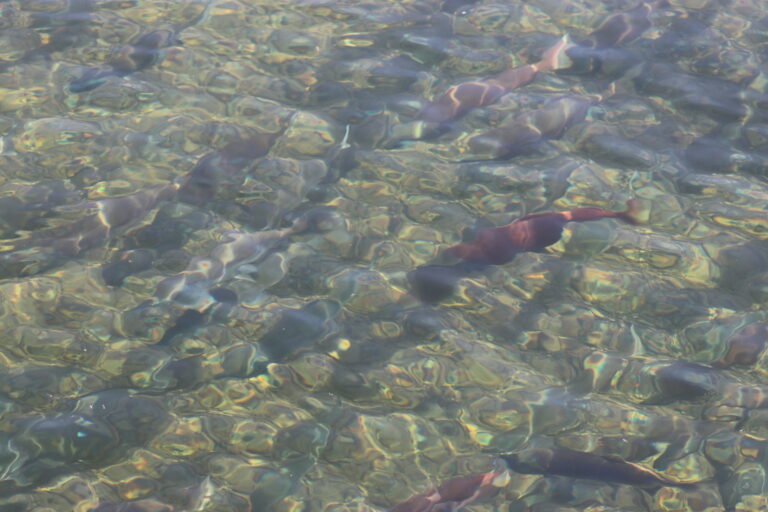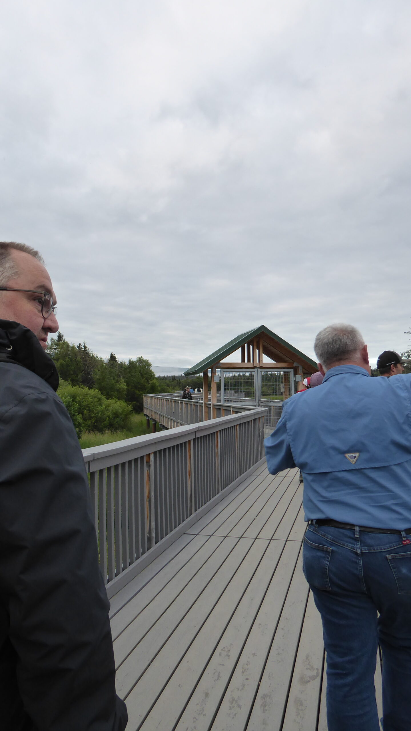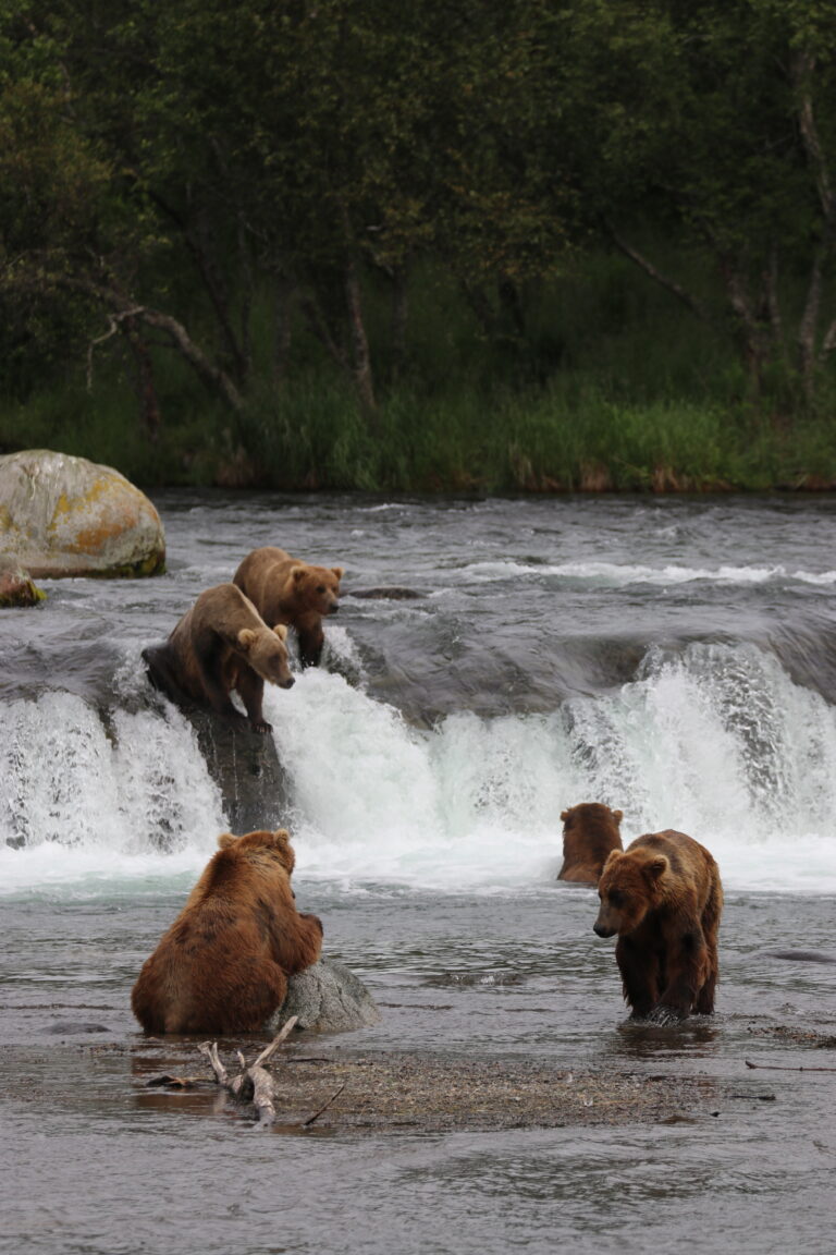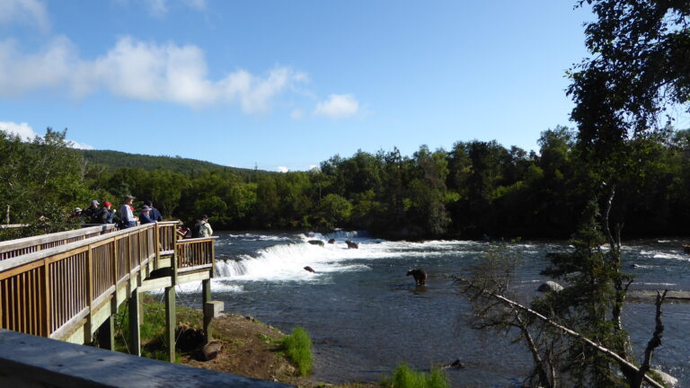 Vanaf het platform had je zeer goed zicht op de vissende beren. Het was een komen en gaan en sommige bleven lang op hun stekje. Na 2 uurtjes te hebben gekeken vanaf de verschillende platformen (Falls en Riffles) zijn we op het gemak terug gewandeld door de bossen.
