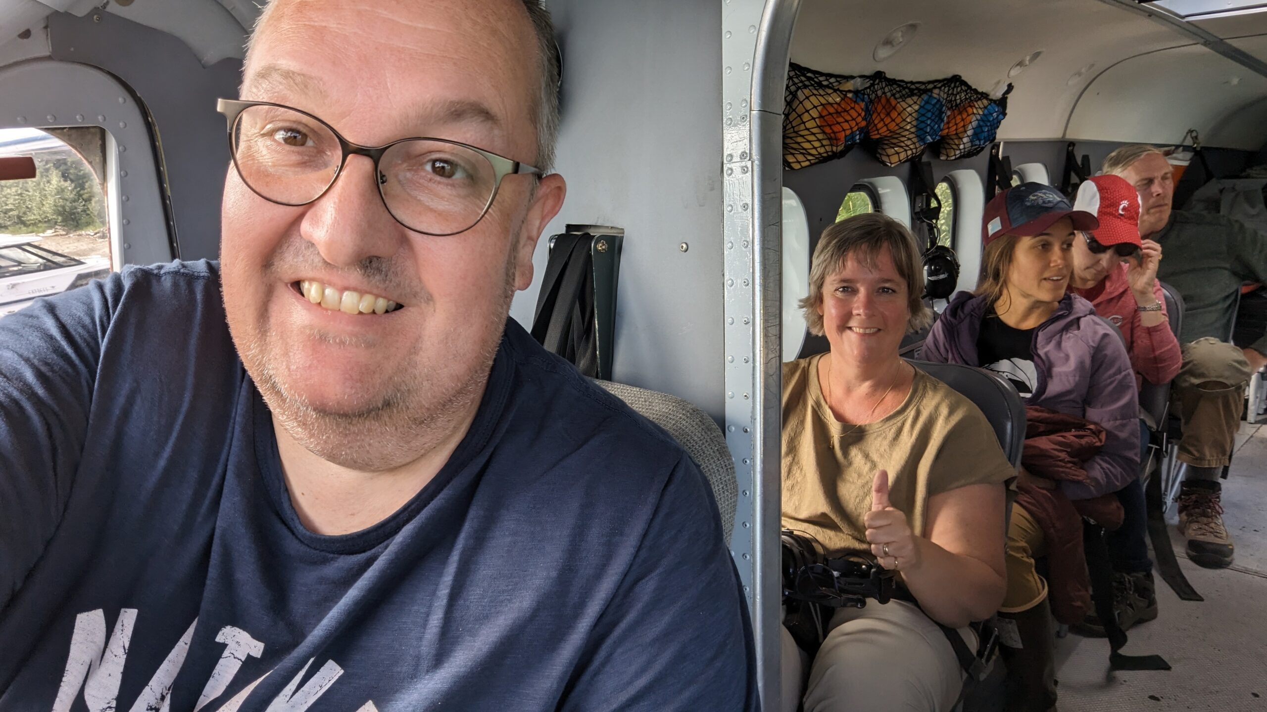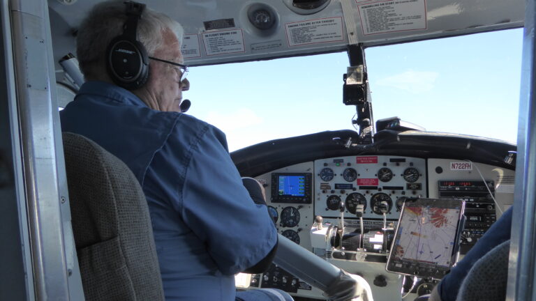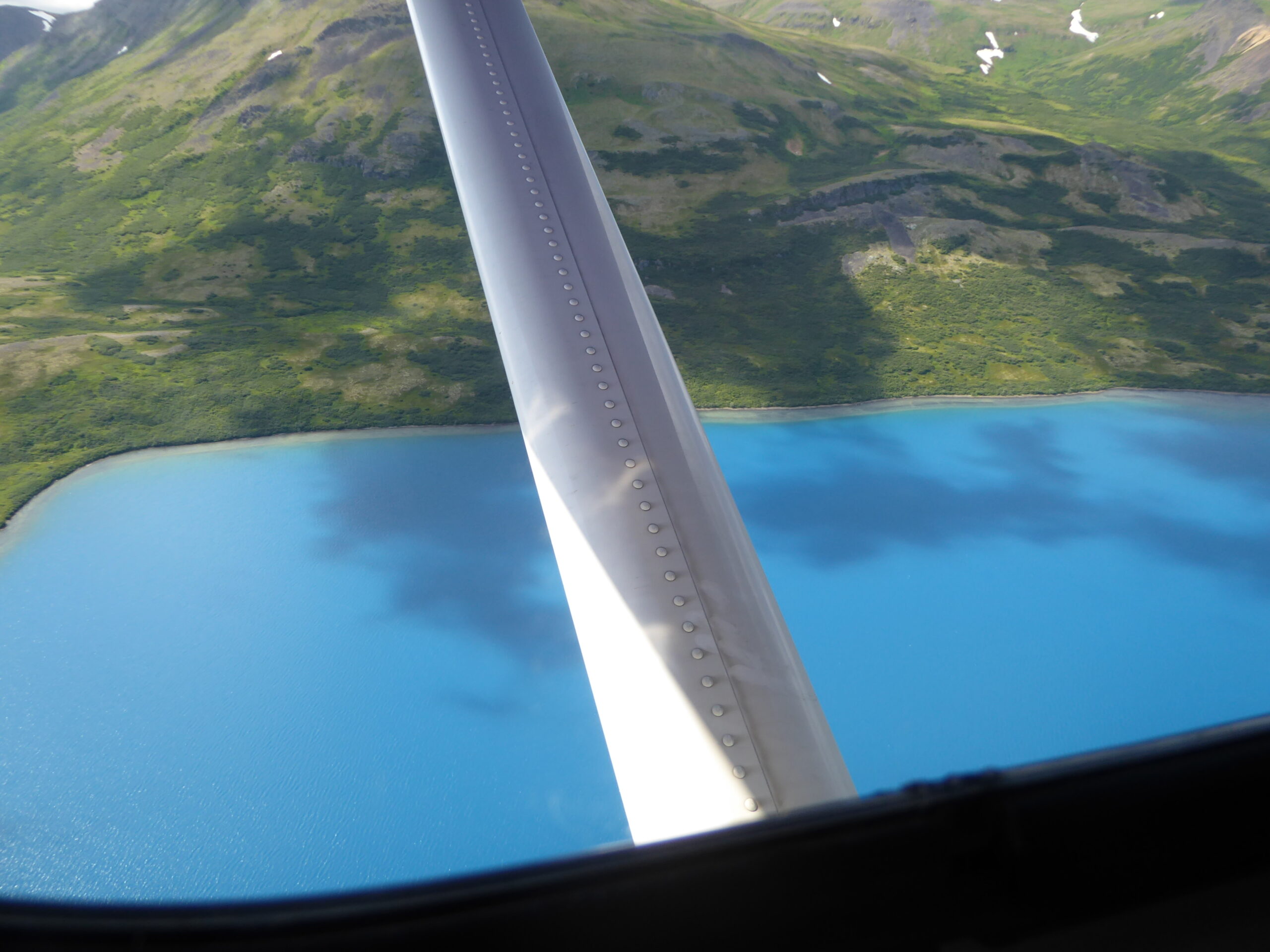Daarna zijn we weer naar het watervliegtuig gegaan voor de terugvlucht. Dré was Don zijn copiloot en had prima zicht vanuit de cockpit. Onderweg terug zijn we wederom over de “Augustine” vulkaan gevlogen. Ook maakte Don nog een omweg om over een helderblauw meer te vliegen (zijn favoriete meer) en hebben we ook nog een paar orka’s gespot.