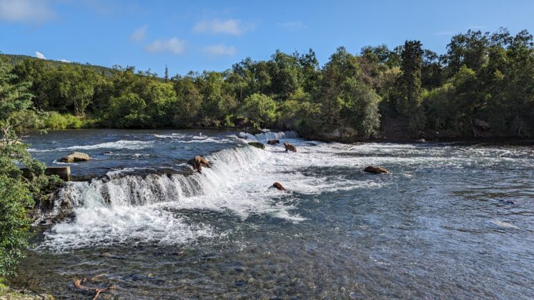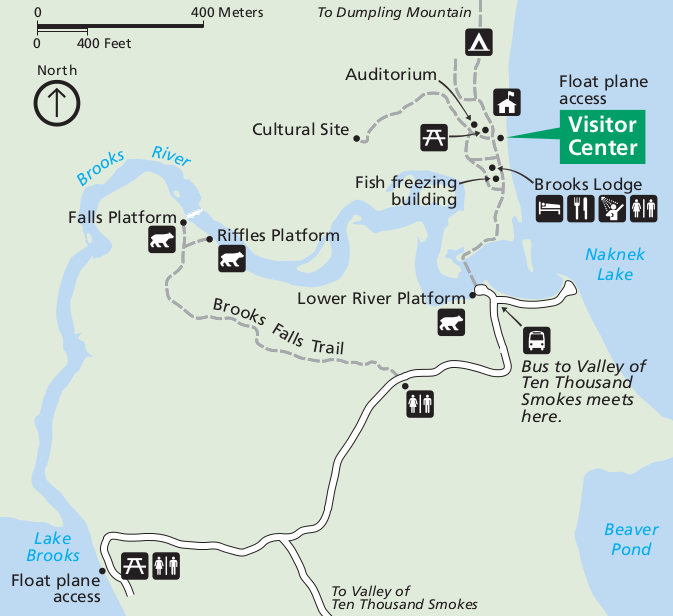 We arriveerden als eerste vliegtuig bij Brooks Falls en hadden zodoende ook de beste parkeerplek op het strand. Na uitstappen meteen de verplichte beren cursus gevolgd, eten in opslag gelegd (je mocht echt niets meenemen, alleen water) waarna we gelijk richting het uitzichtpunt op de watervallen zijn gewandeld.