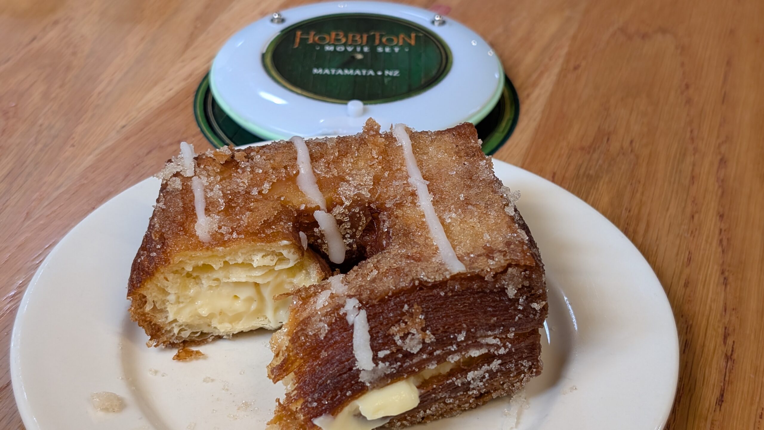 Onderweg regent het zo nu en dan stevig maar als we eenmaal aankomen bij de Hobbiton movie set lijkt het aardig op te klaren. We zijn 40 minuutjes te vroeg dus genoeg tijd voor een bakje koffie met een heerlijke cronut. Een heerlijk gebakje dat we door Wilco in New York hebben leren kennen en wat blijkbaar op meer plekken van de wereld populair aan het worden is.