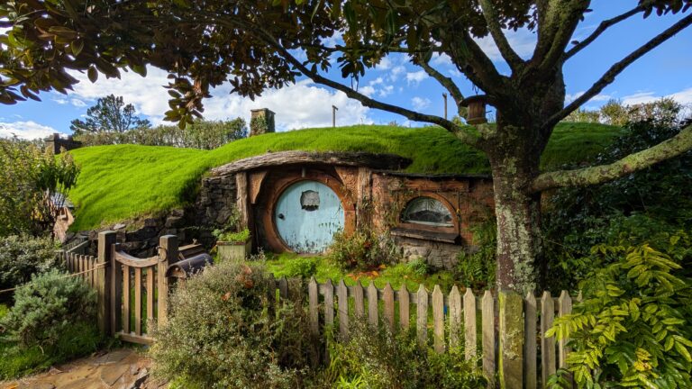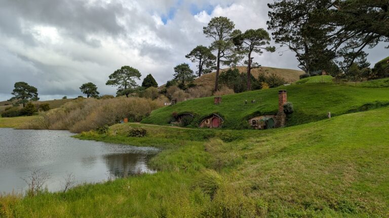 We zorgen dat we op tijd inchecken en kunnen zodoende met een bus eerder mee richting de Hobbiton movie set. We hebben een leuke gids die erg duidelijk is die ons de komende 2 uur mee op pad neemt. De Hobbiton movie set is geen attractiepark vol toeters en bellen maar het is gewoon wat het is, de film locatie van “de Shire” voor de trilogieën van “de Lord of the Rings” en “de Hobbits”