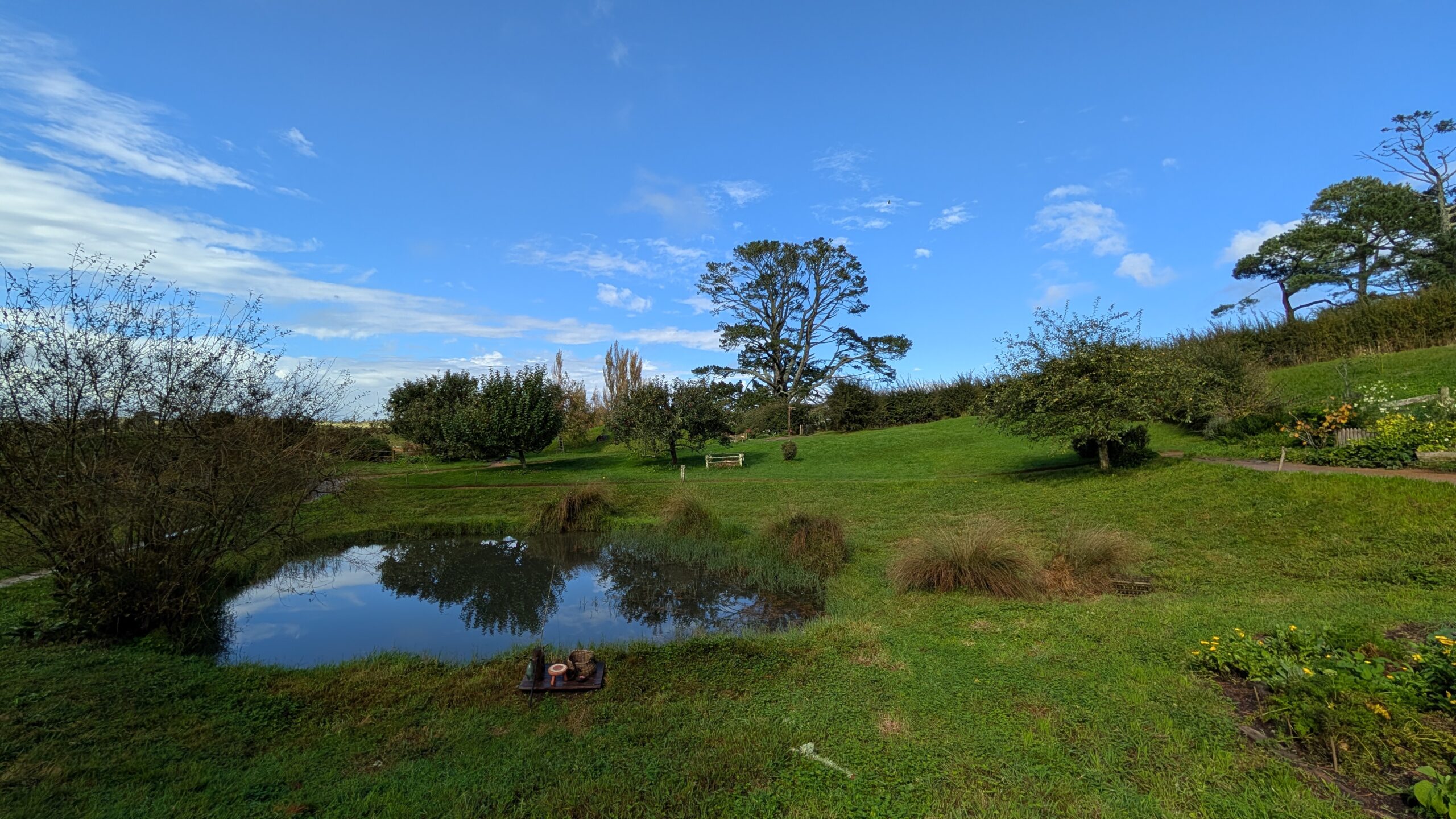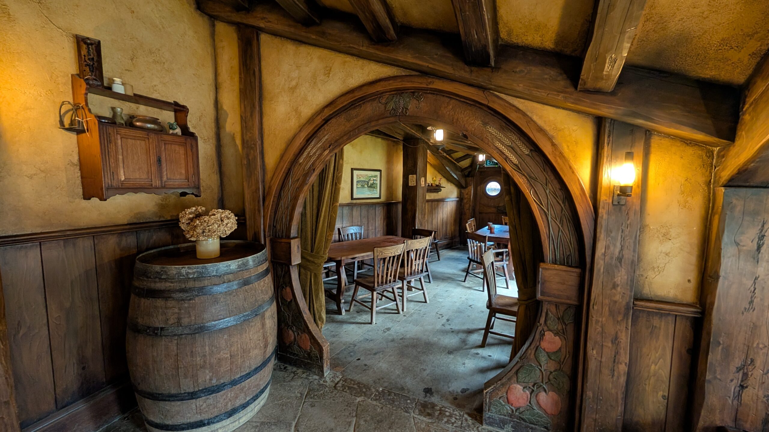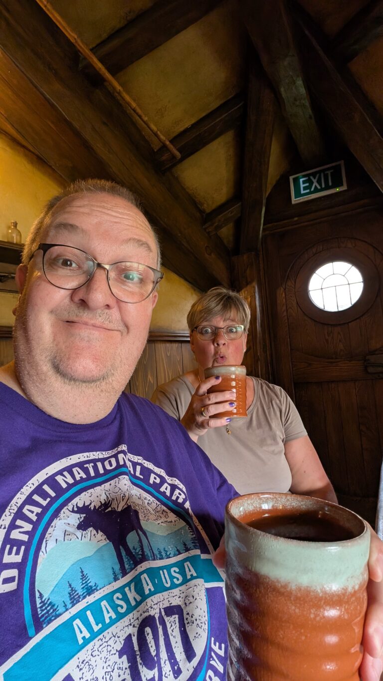 Na de bezichtiging van het Hobbit huisje wandelen we over de prachtige stenen brug richting “the Green Dragon” waar we worden getrakteerd op een drankje naar keuze. Uiteraard geheel in Hobbit stijl. Sieg neemt het gemberbier en Dré de cider. We krijgen hier nog lekker de tijd om ons drankje op te drinken en nog buiten fotootjes te schieten en rond te kijken waarna we richting uitgang nog langs de visvijver en weer door de tuin teruglopen.